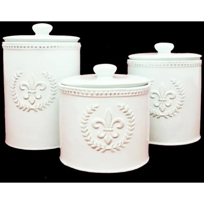 Cream Ceramic Fleur de Lis Canisters Set of 3 - The Fleur de Lis a stylized lily composed of three petals bound together near their bases, especially known from the former royal arms of France. These counter canisters will bring a royal flair to your home.