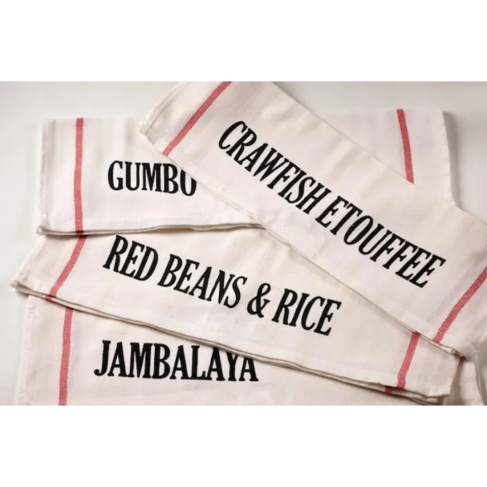 NOLA Dishes Set of 4 Kitchen Towels -These red stripe dishtowels towels are hand stamped using water-based inks. The towels are 100% cotton, 4-sided hem and have a hook for hanging and are machine washable. This set includes FOUR stamped towels; they read ‘Gumbo’, ‘Jambalaya’, ‘Crawfish Etouffee’ and ‘Red Beans & Rice’.