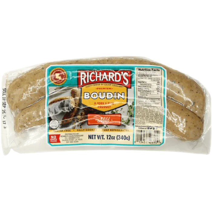 Richard's Cajun Country Boudin: A pork and rice product Great on the grill!. Cook and serve. Certified Cajun, a product of Louisiana