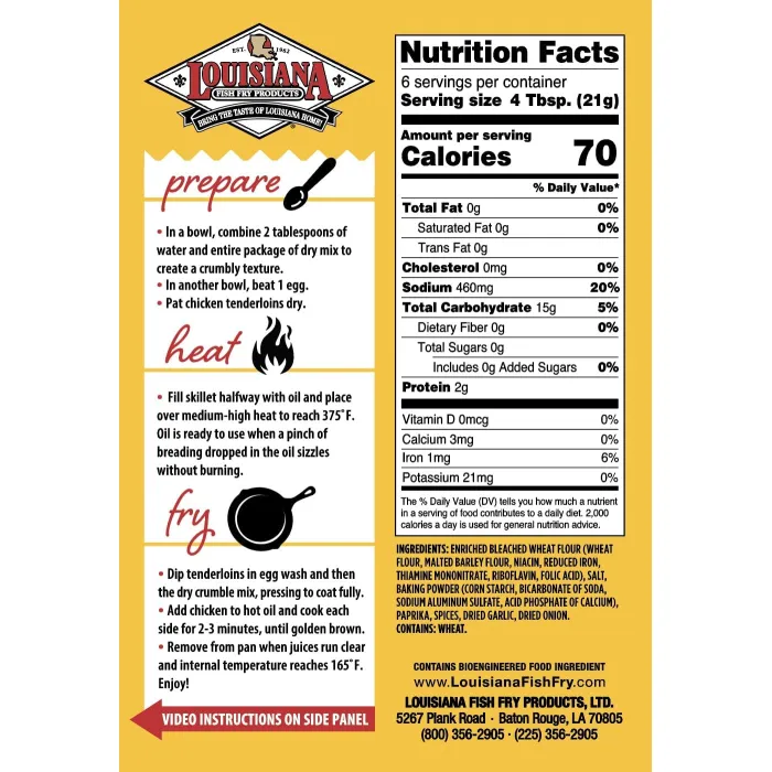 Made with enriched bleached wheat flour, yellow corn flour, and a blend of spices, this coating mix is your secret to delicious, crispy chicken tenders. Just mix with water, coat your chicken, and fry to golden perfection.