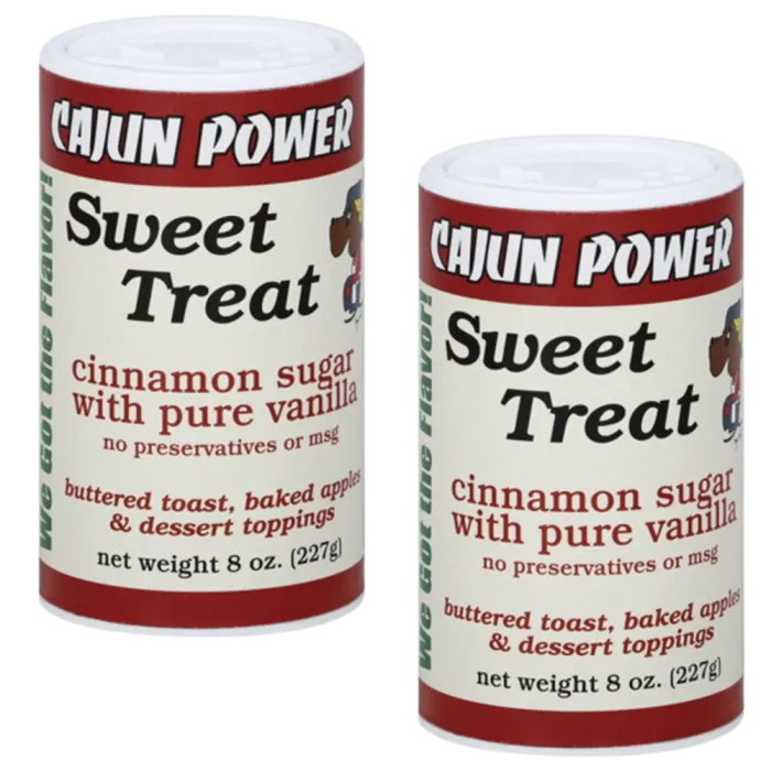 Cajun Power® Sweet Treat a perfect blend of cinnamon, sugar and pure vanilla that goes great with Toasted Bread, Cakes, Bread Pudding, Raisin Bread, Cookies, Applesauce or just Sprinkle Cajun Power Sweet Treat on Cooked Cereal, Fruits and Deserts.