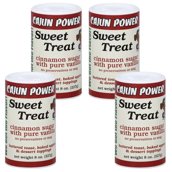 Cajun Power® Sweet Treat a perfect blend of cinnamon, sugar and pure vanilla that goes great with Toasted Bread, Cakes, Bread Pudding, Raisin Bread, Cookies, Applesauce or just Sprinkle Cajun Power Sweet Treat on Cooked Cereal, Fruits and Deserts.