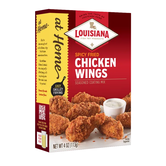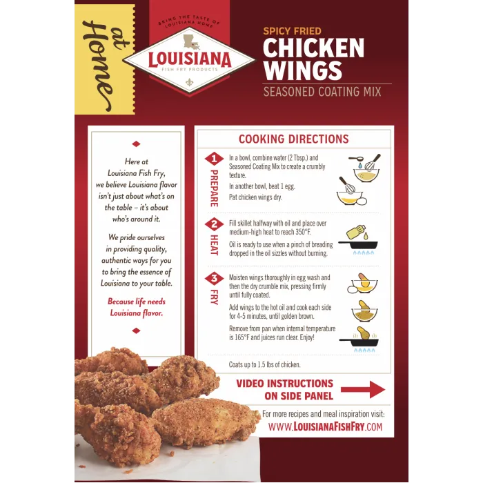 Our mix is designed for those who love their chicken wings with an extra kick. It's the perfect blend of spices and crispy coating for a mouth-watering dish. Transform your kitchen into a haven of Southern flavors with the Louisiana Fish Fry At Home Spicy Chicken Wings Seasoned Coating Mix. This product promises to make your chicken wings irresistible.