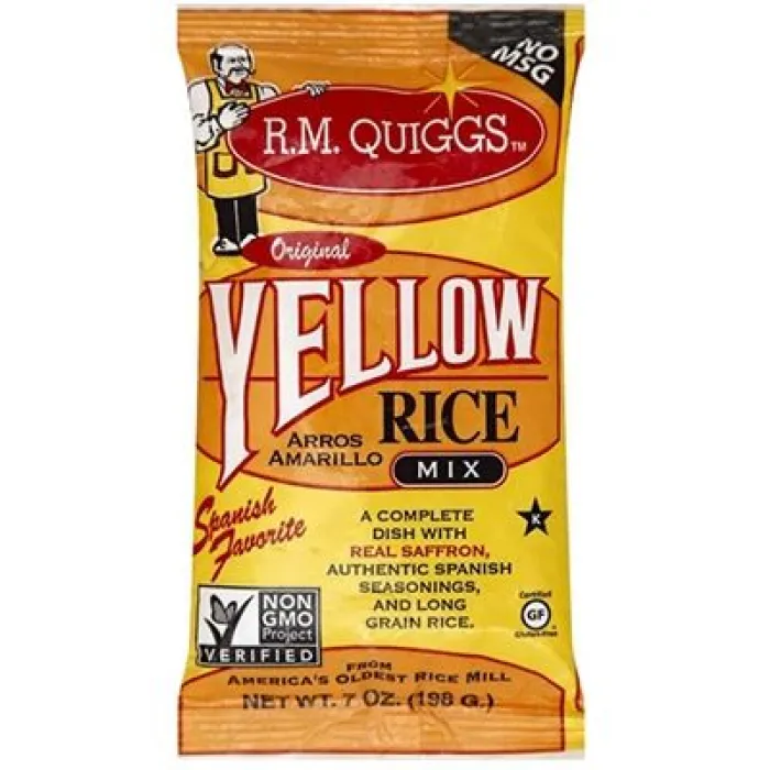 R.M. QUIGGS Yellow Rice Mix is a one-of-kind product that makes an excellent side dish or cool rice salad. A masterful blend of authentic Spanish Seasonings and real Saffron, all mixed with our premium quality Long Grain Rice.