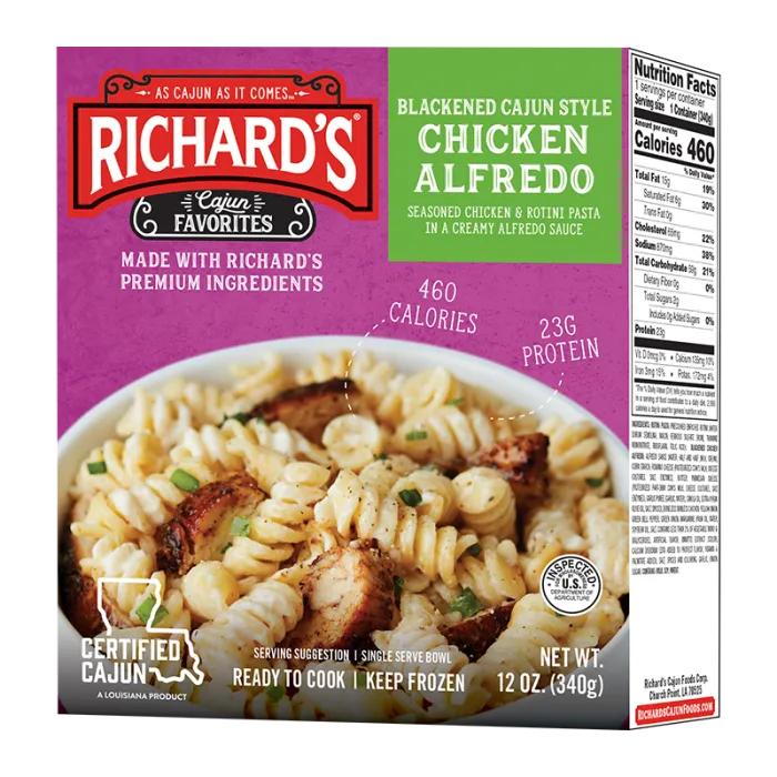 Creamy, cheesy and spicy. Our Blackened Cajun Style Chicken Alfredo is made with perfectly seasoned chicken and rotini pasta in a luscious cream Alfredo sauce. Single serving.