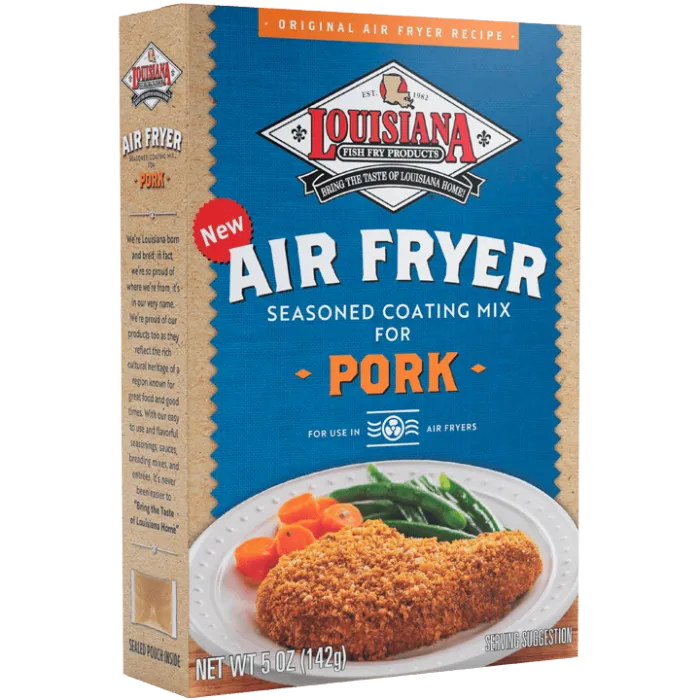 Specifically formulated for use in Air Fryers Can also be used in a conventional oven Each Box Coats approximately 2 lbs of pork Can be used with bone-in or boneless cuts of pork Ease of use gives maximum crunch and full flavor every time! The perfect cooking companion Easy to use and specifically created for air fryers so you can enjoy delicious and perfectly crispy fish, chicken, or pork quickly, and with less oil than regular frying!